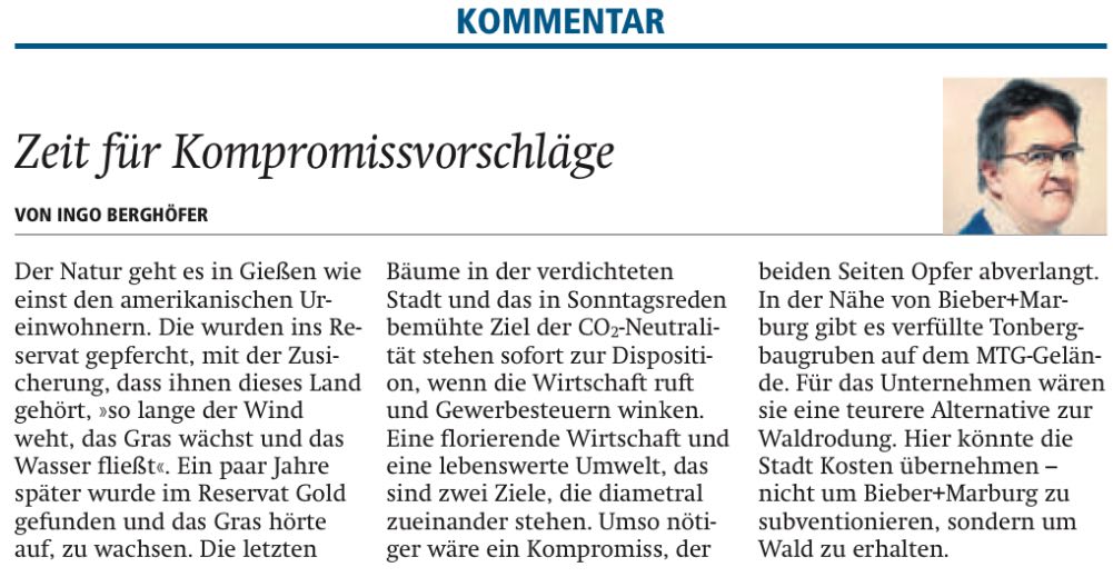 Der Magistrat treibt die Betriebserweiterung von Bieber+Marburg, für die über 45.000 m² Schutz- und Erholungswald gerodet werden sollen, voran. Im letzten KUNSEV-Ausschuss wurde über den nach der ersten Offenlage angepassten Bebauungsplan diskutiert. Alle Fraktionen mit Ausnahme der Fraktionsgemeinschaft von „Gigg – Gießen gemeinsam gestalten“ und Volt befürworteten dort die Rodung.